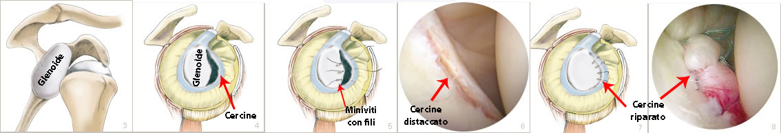 Due o tre miniviti (dette "ancore") sono avvitate nel margine antero-inferiore della glenoide. I fili montati su quest’ancora sono passati attraverso il cercine periglenoideo, la capsula ed i legamenti (Figura 5), poi legati fino a fissare queste strutture all’osso (Figura 7 e 8).